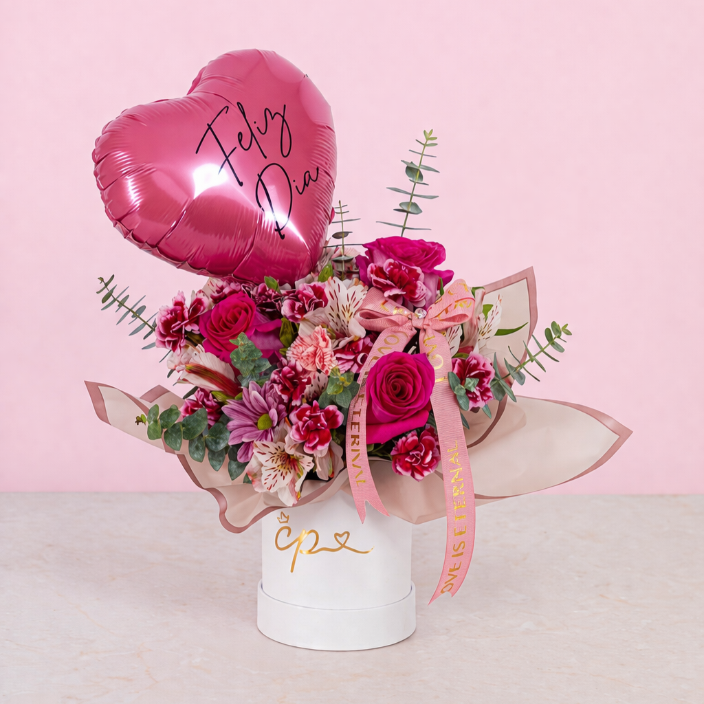 Astromelias rosadas Follaje Verde Rosas Violetas Box Rojo decorado Peluche Cerdita + Coronita Globo Te...
