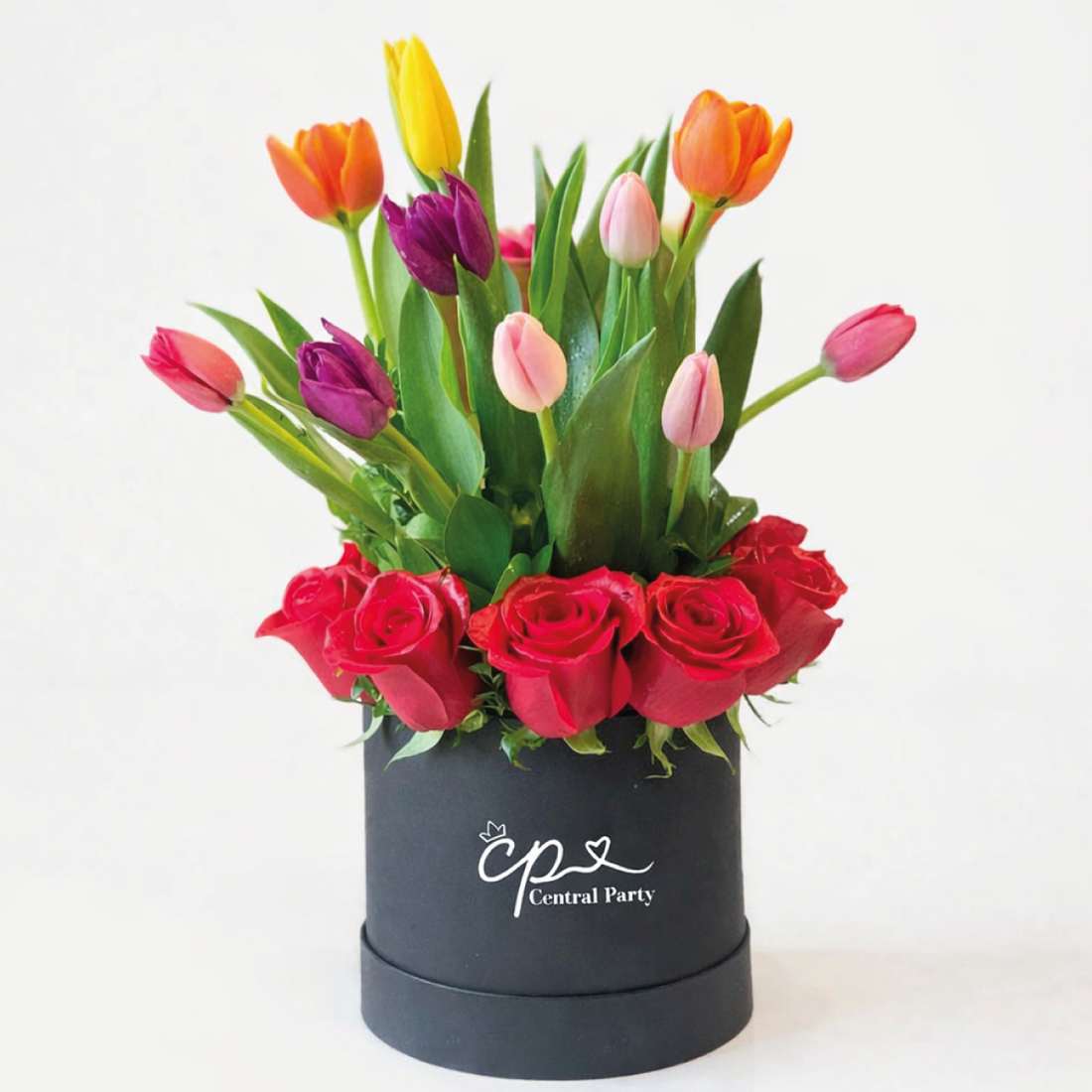 Colores mixtos de Tulipanes (Amarillo, naranja, rojo, lila, blanco, rosado, etc.) + 12 Rosas rojas...