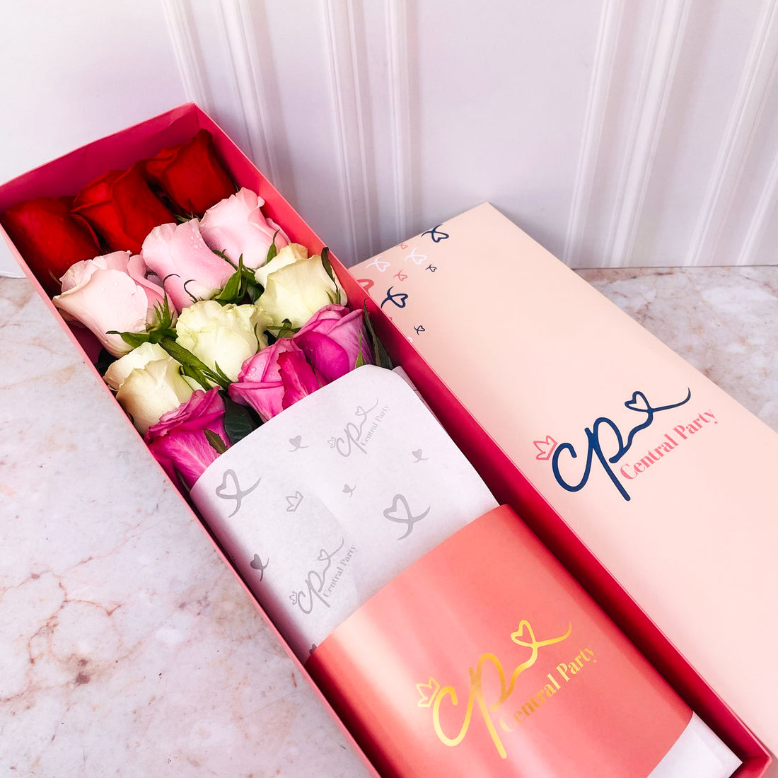 Caja con 12 Rosas de colores + Tarjeta dedicatoria