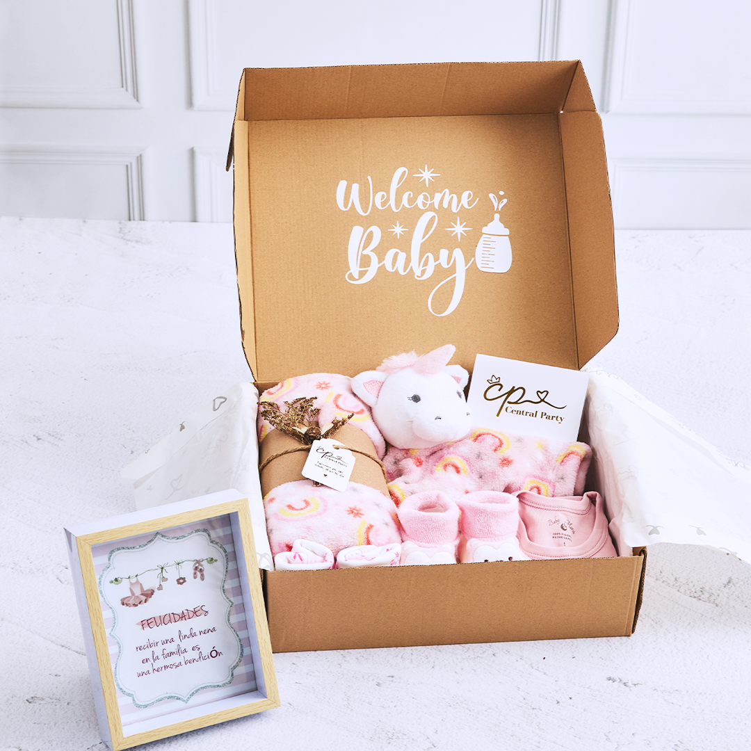 Sábana rosa zapatitos rosa Ropa bebé rosa Peluche unicornio rosa Porta retrato Box decorado cartón...