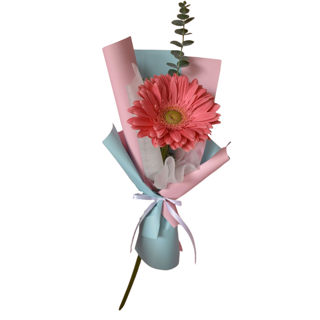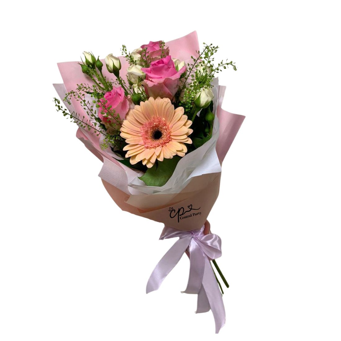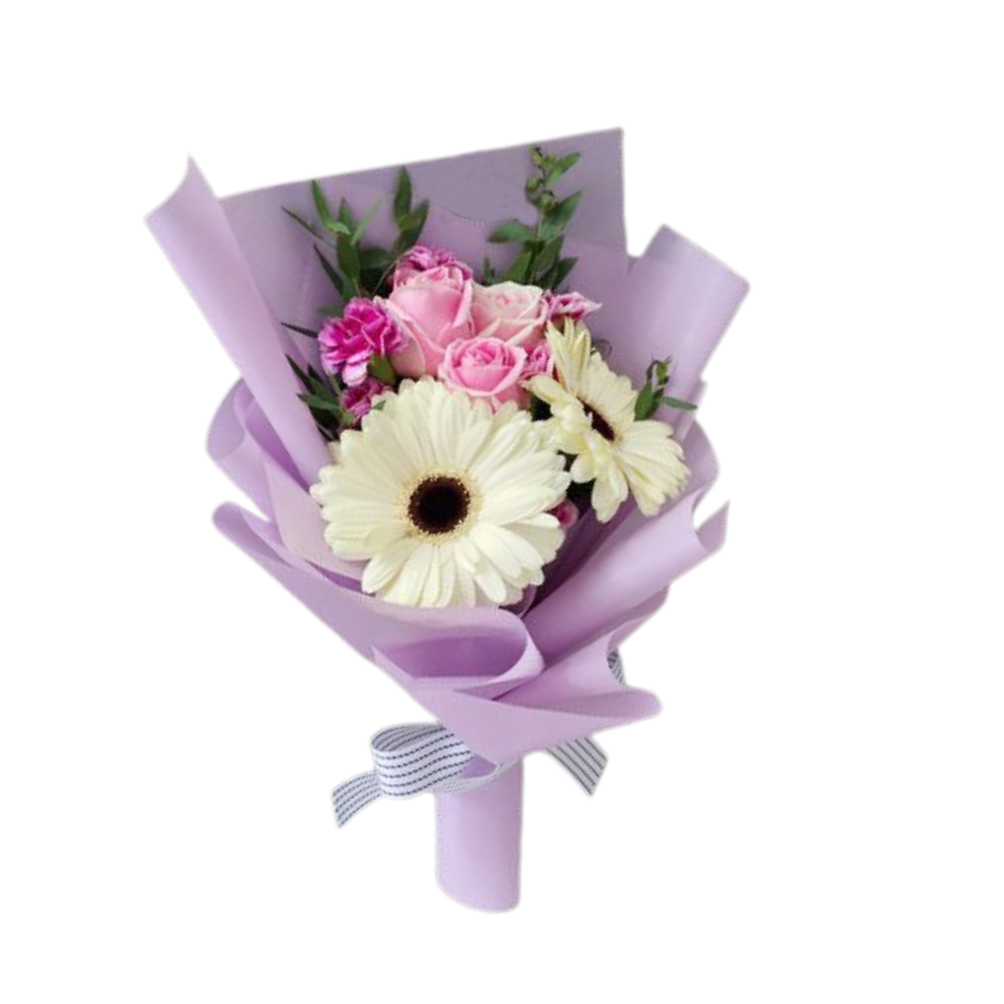 Envoltura estilo coreano 2 Gerberas blancos 3 Rosas fucsias y rosadas Claveles y follajes verdes...
