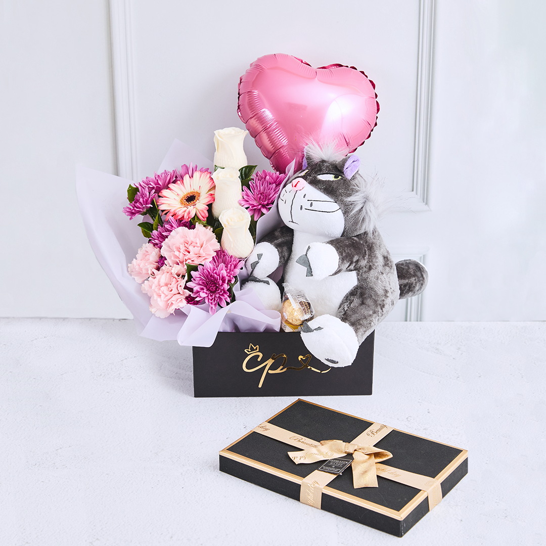 Peluche Gato Gruñon Lucifer Globo Corazón personalizado Mix Flores Pasteles (Rosas blancas, Gerberas, Pompones rosas,...