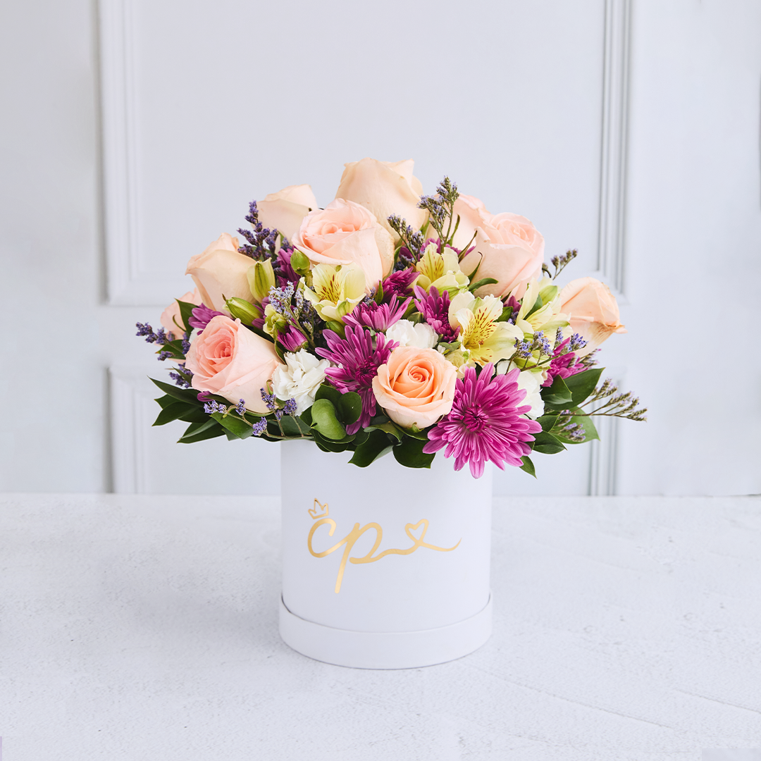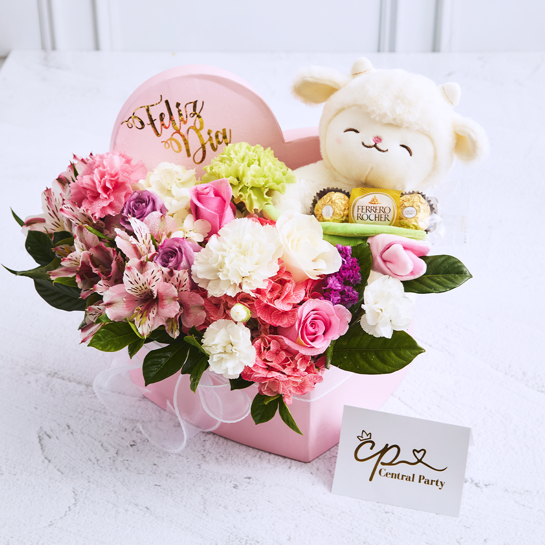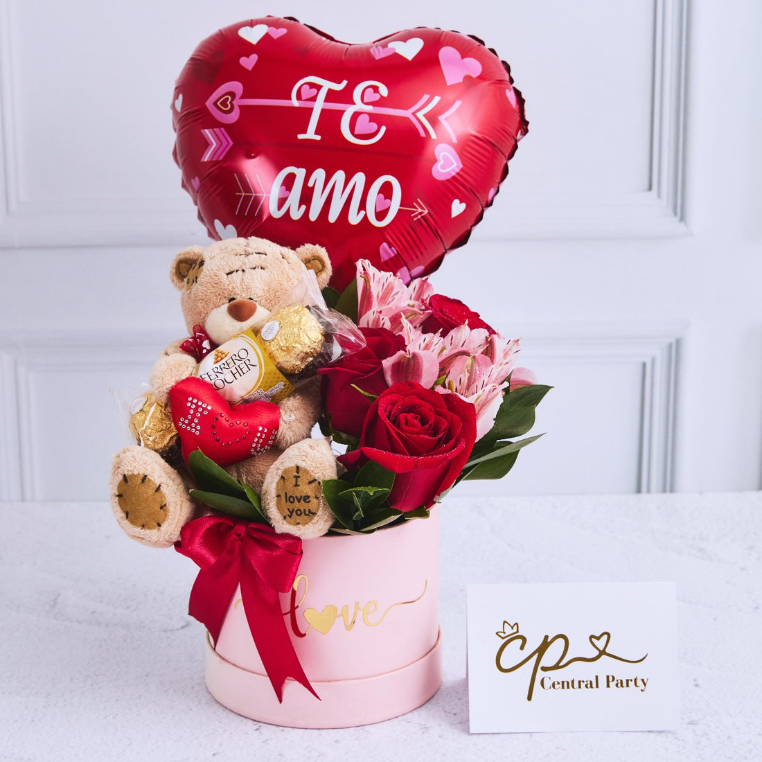 Astromelias rosadas Follaje Verde Rosas Violetas Box Rojo decorado Peluche Cerdita + Coronita Globo Te...
