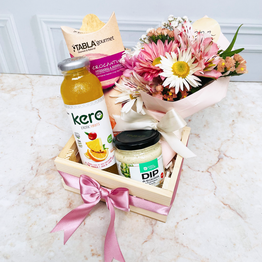 Jugo KERO Frasco Dip Alcachofas Galletas Crocantinis Mini Ramos Flores Violeta Caja madera + Listón...