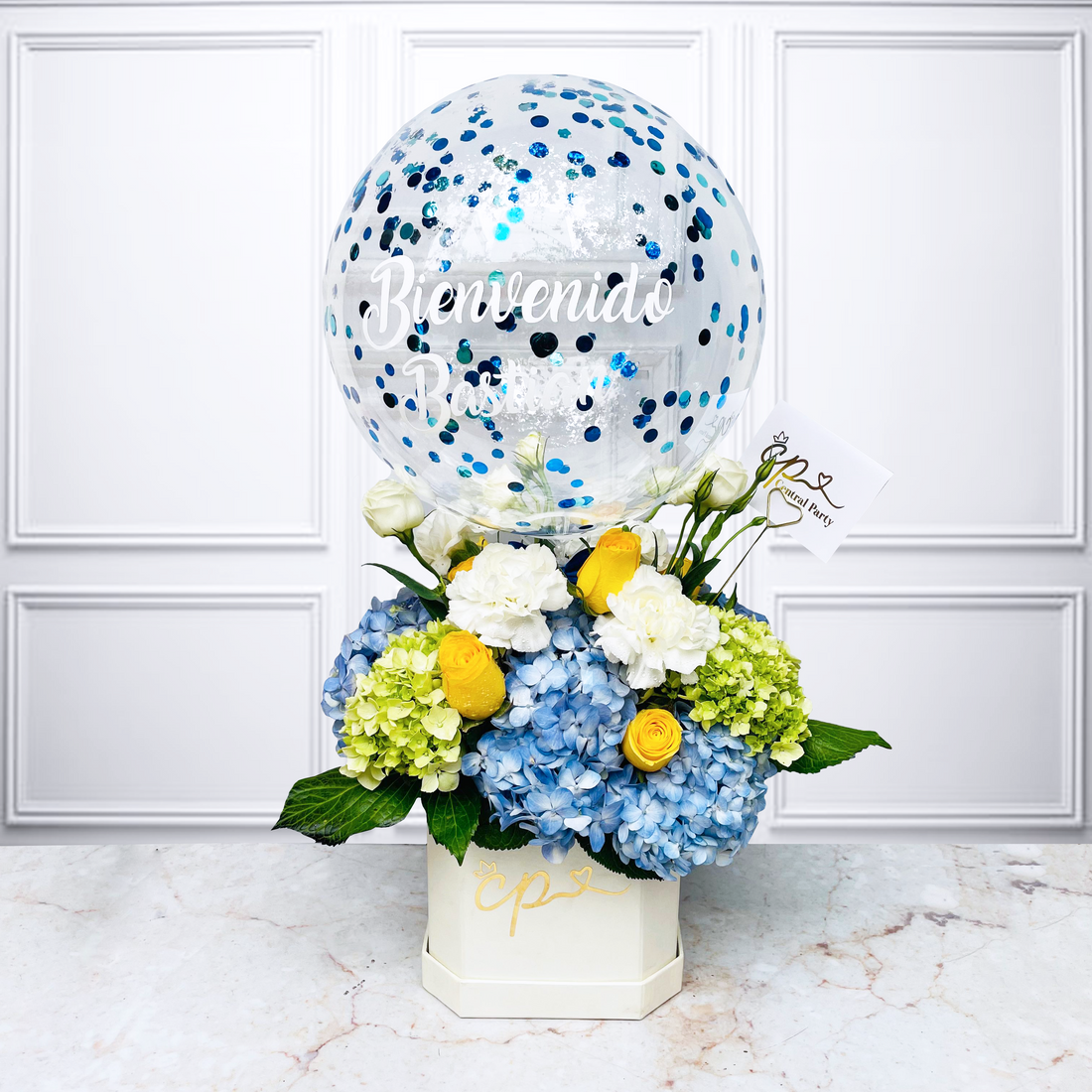 Hortensias verdes & azules Pompones blancos Rosas amarillas & blancas Follaje Verde Globo Burbuja personalizado...