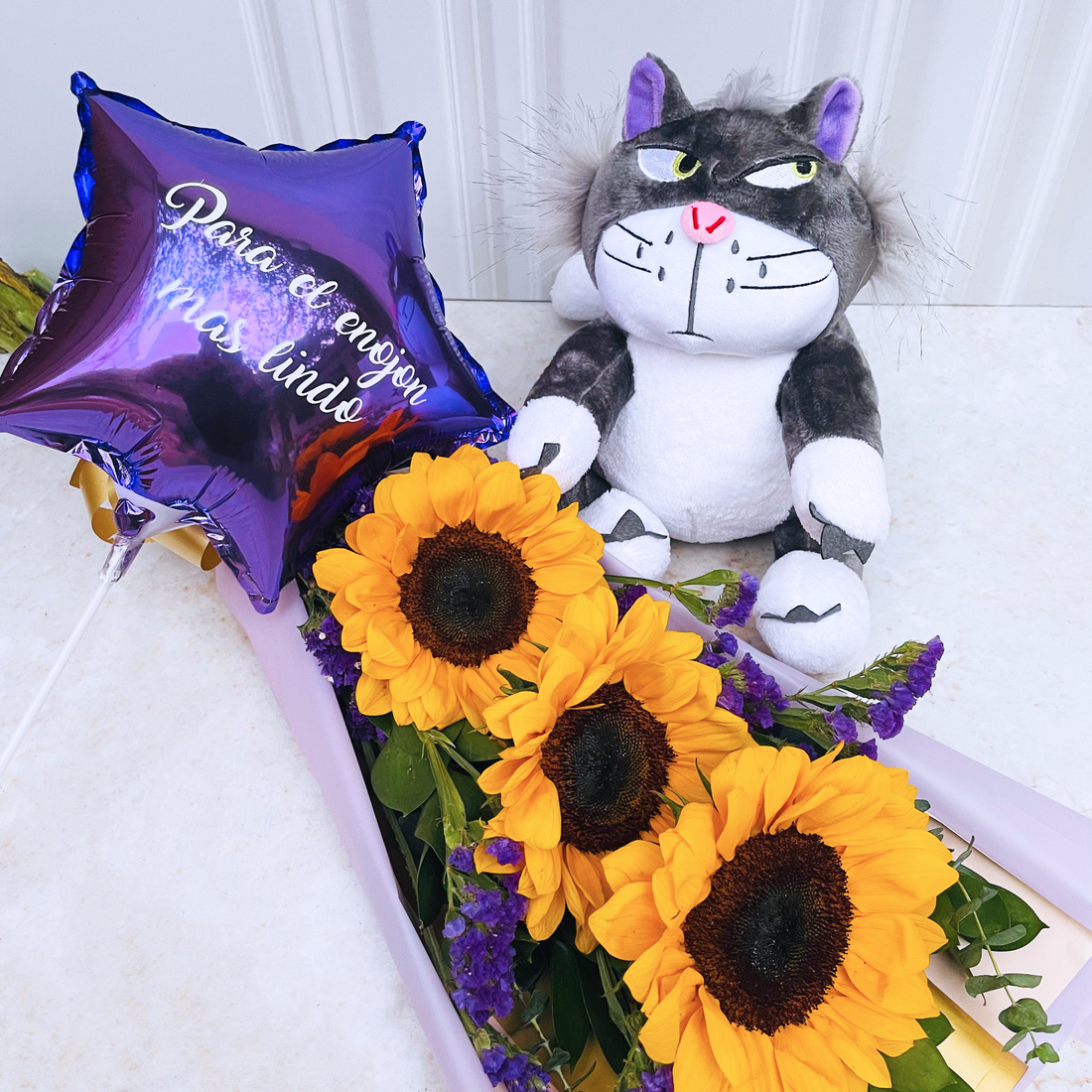 Pack Ramo Girasoles + Gato Gruñon. Trío de Girasoles seleccionados con ramo alto y peluche...