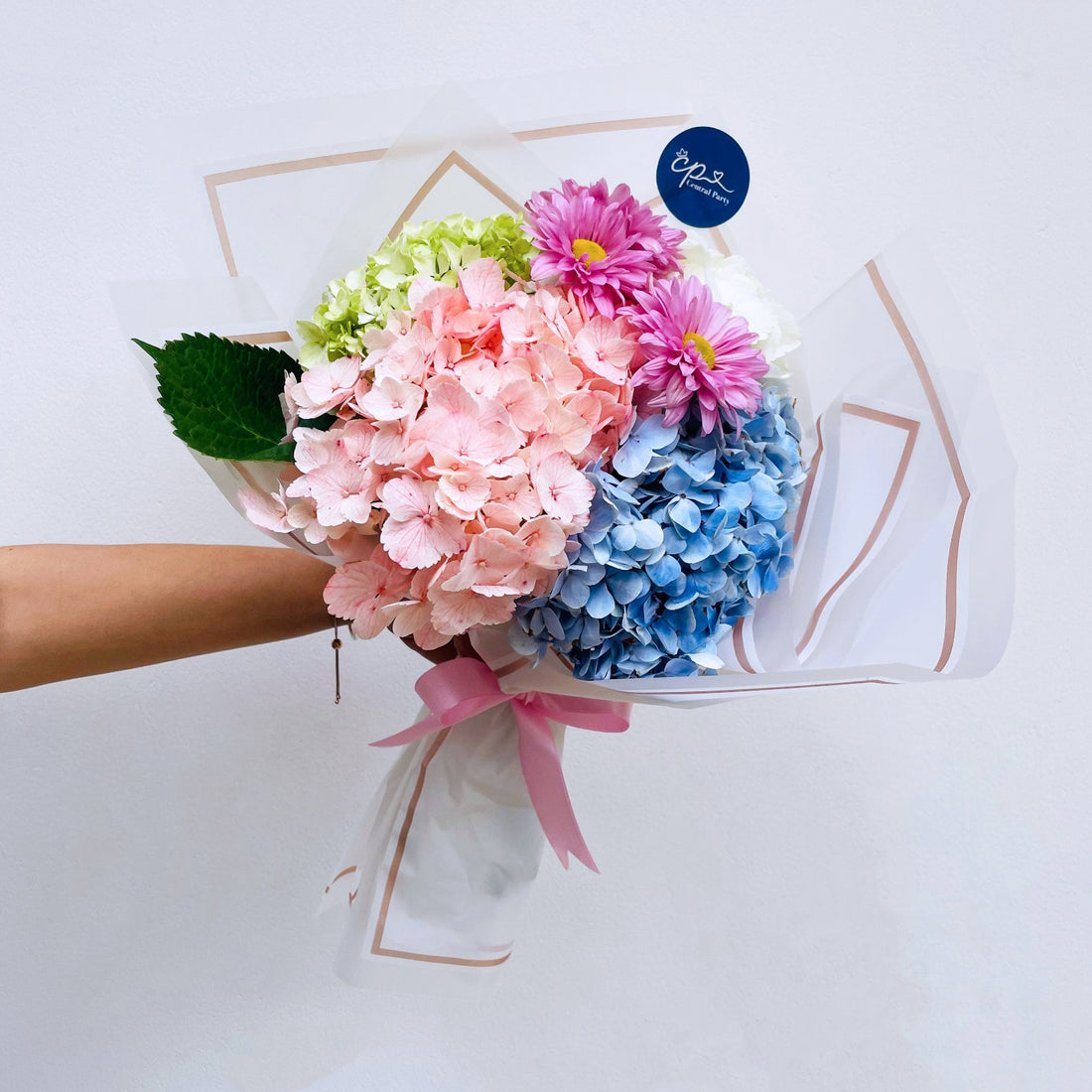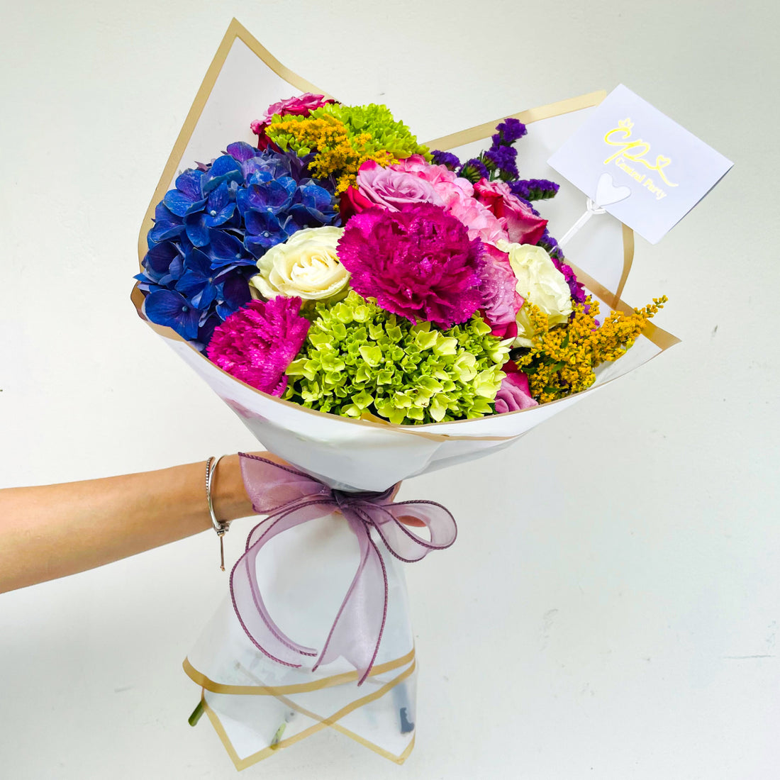 Mix de pompones, hortensias, rosas y follaje, envuelto con papel coreano perfumado.