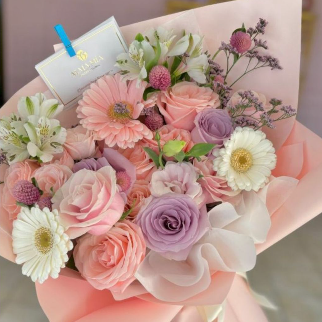 Mix de pompones, rosas, astromelias rosadas y follaje blanco, envuelto con papel coreano perfumado rosa.