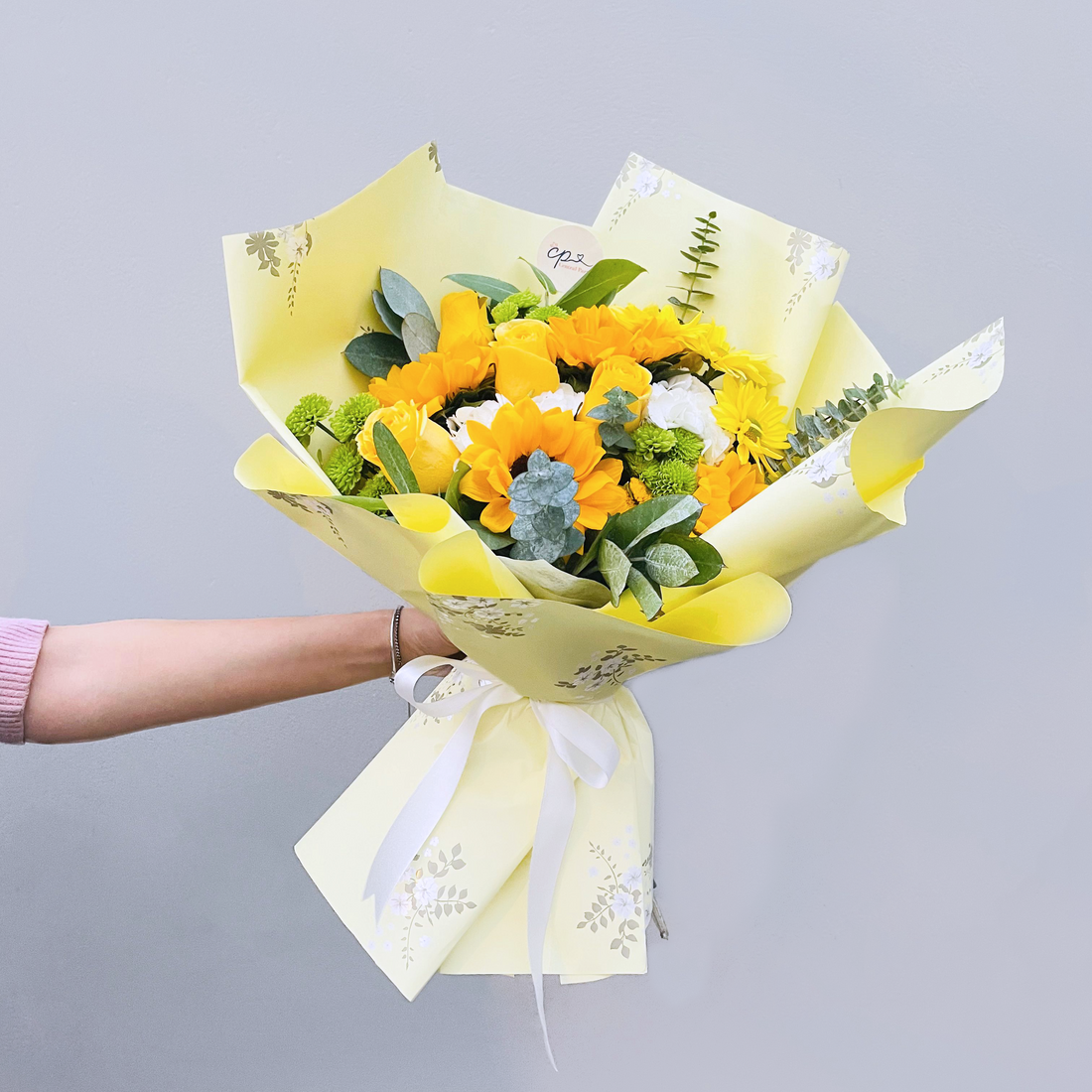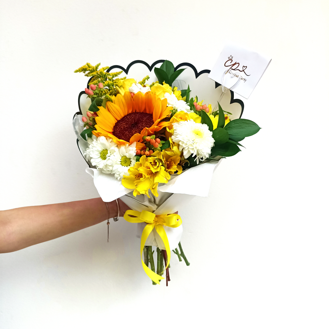 04 girasoles seleccionados 04 rosas amarillas 02 hortensias blancas Botón verde Margarita amarilla Follaje verde...