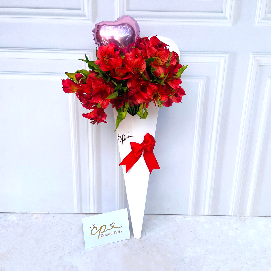 Mini Ramo Astromelias Rojas. Ramito estilo cono con Astromelias Rojas frescas y Follaje verde. Incluye...