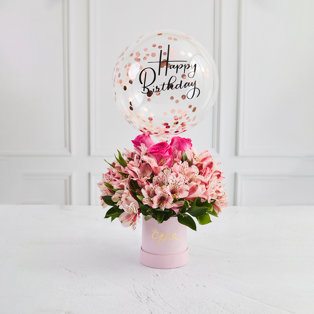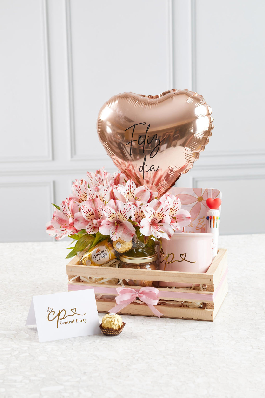 Astromelias rosadas Follaje Verde Rosas Violetas Box Rojo decorado Peluche Cerdita + Coronita Globo Te...