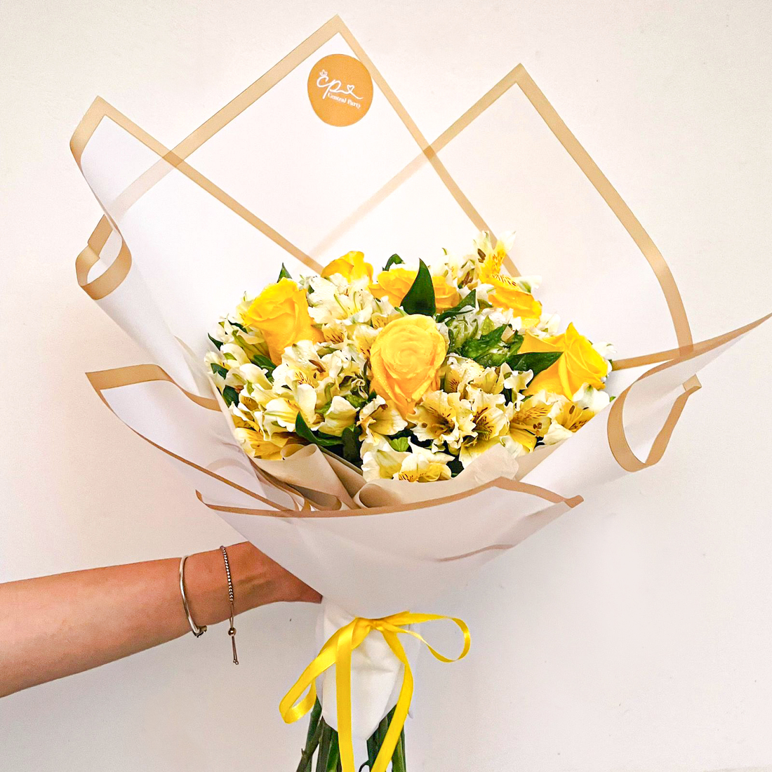 Astromelias Amarillas Follaje Verde Listón Amarillo Papel perfumado estilo periódico Este 21 de...