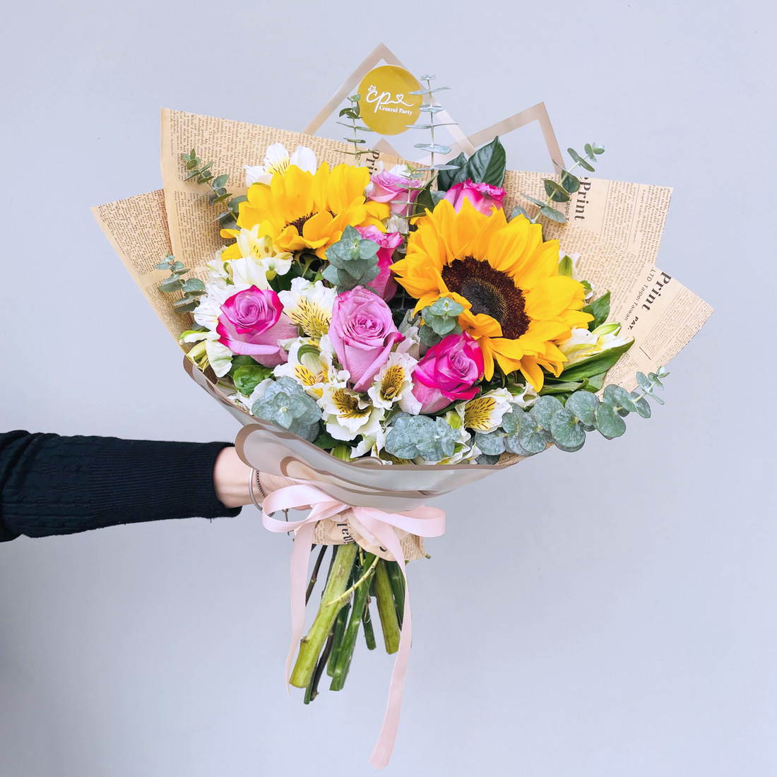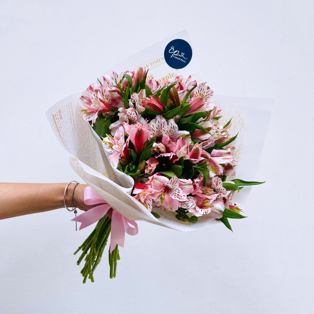 Mini Ramito Astromelias. Hermoso detalle floral para sorprenderla, incluye tarjeta dedicatoria y papel coreano perfumado.