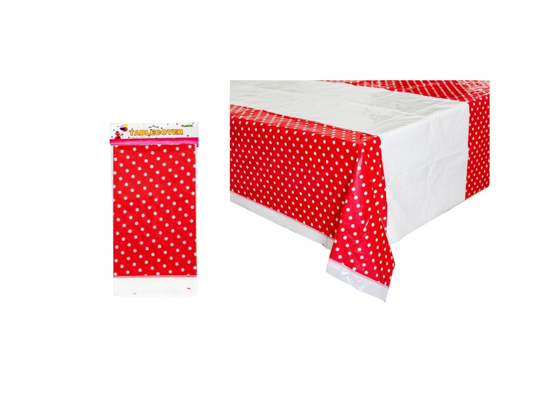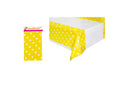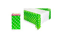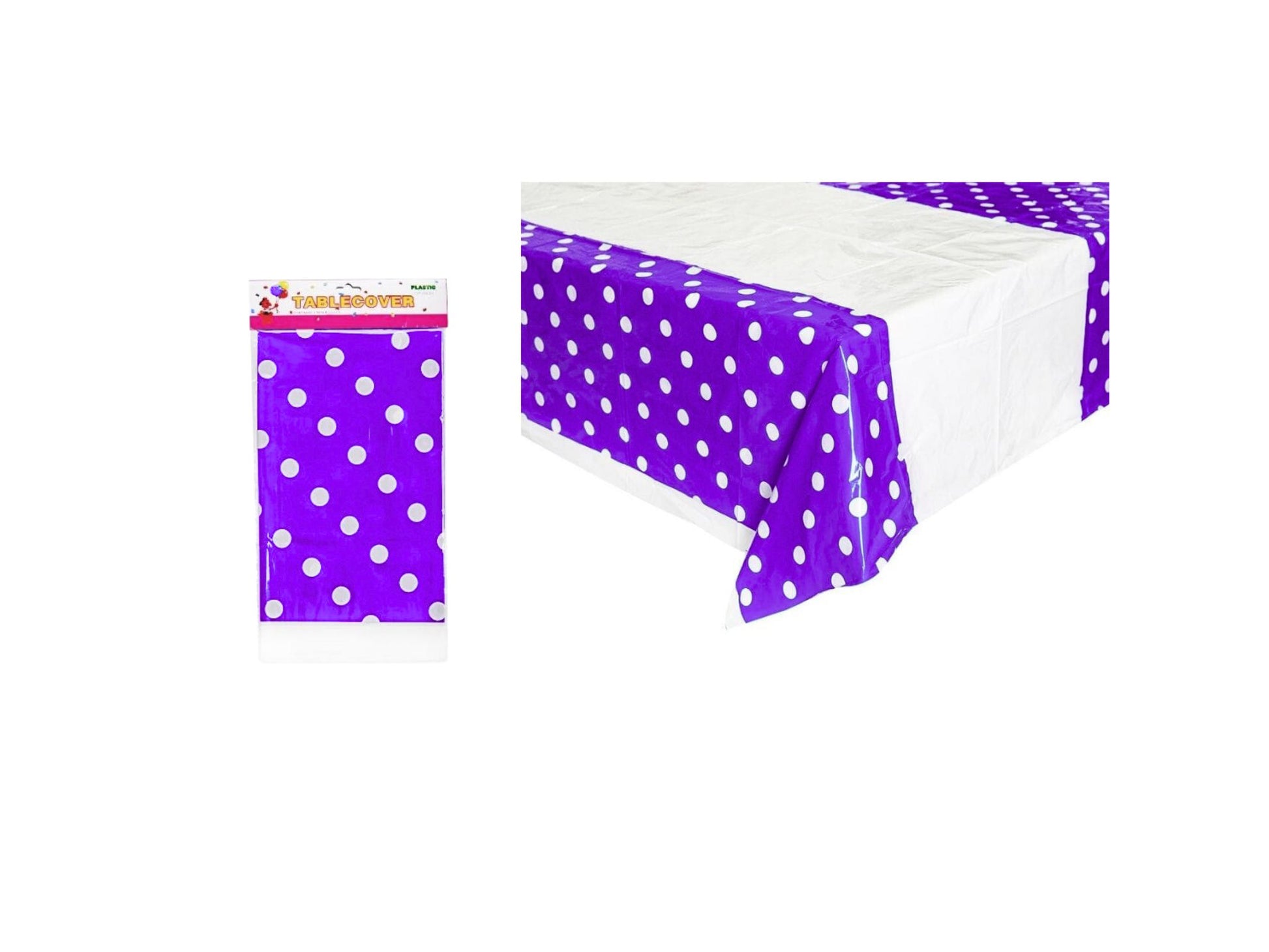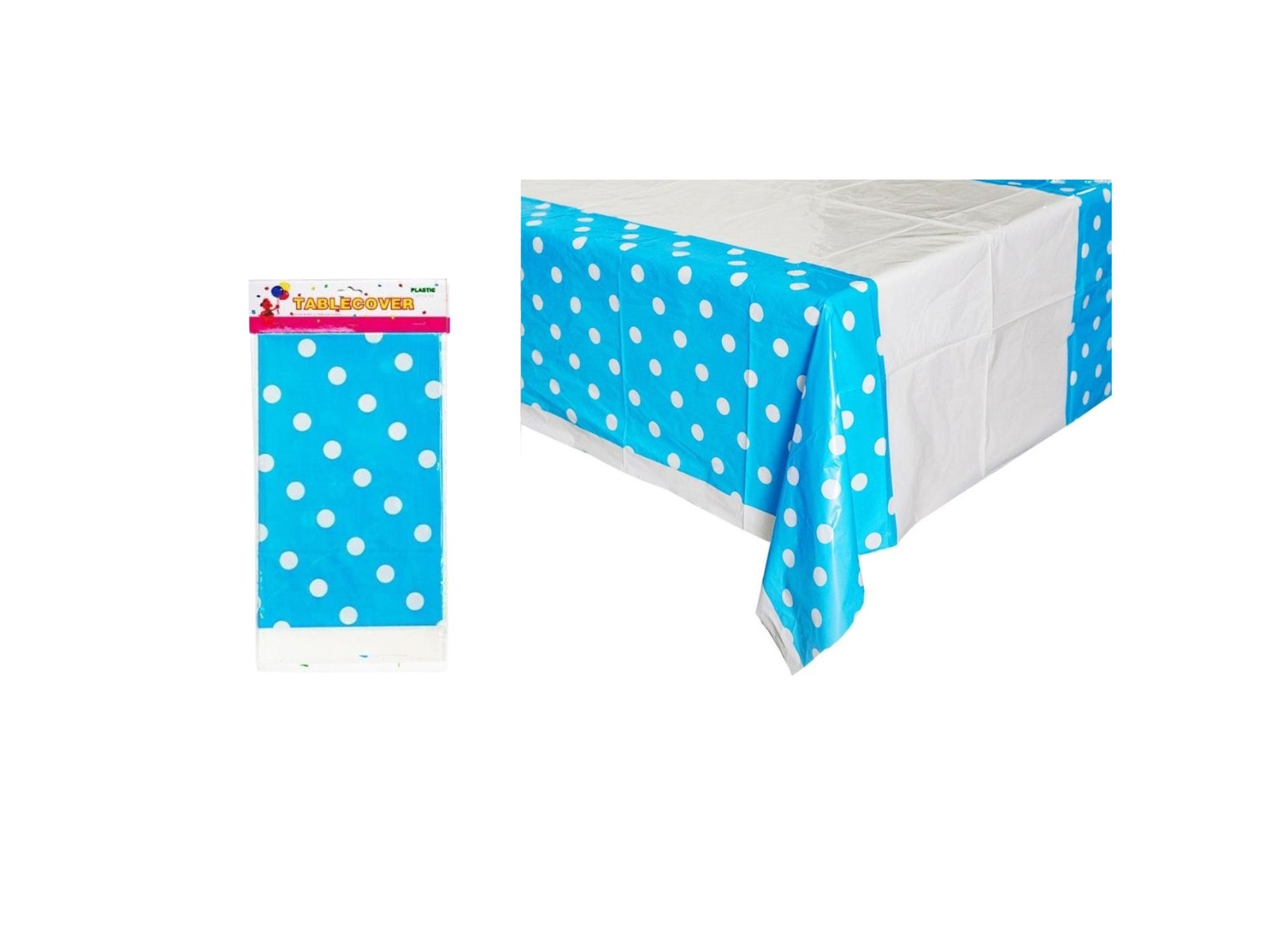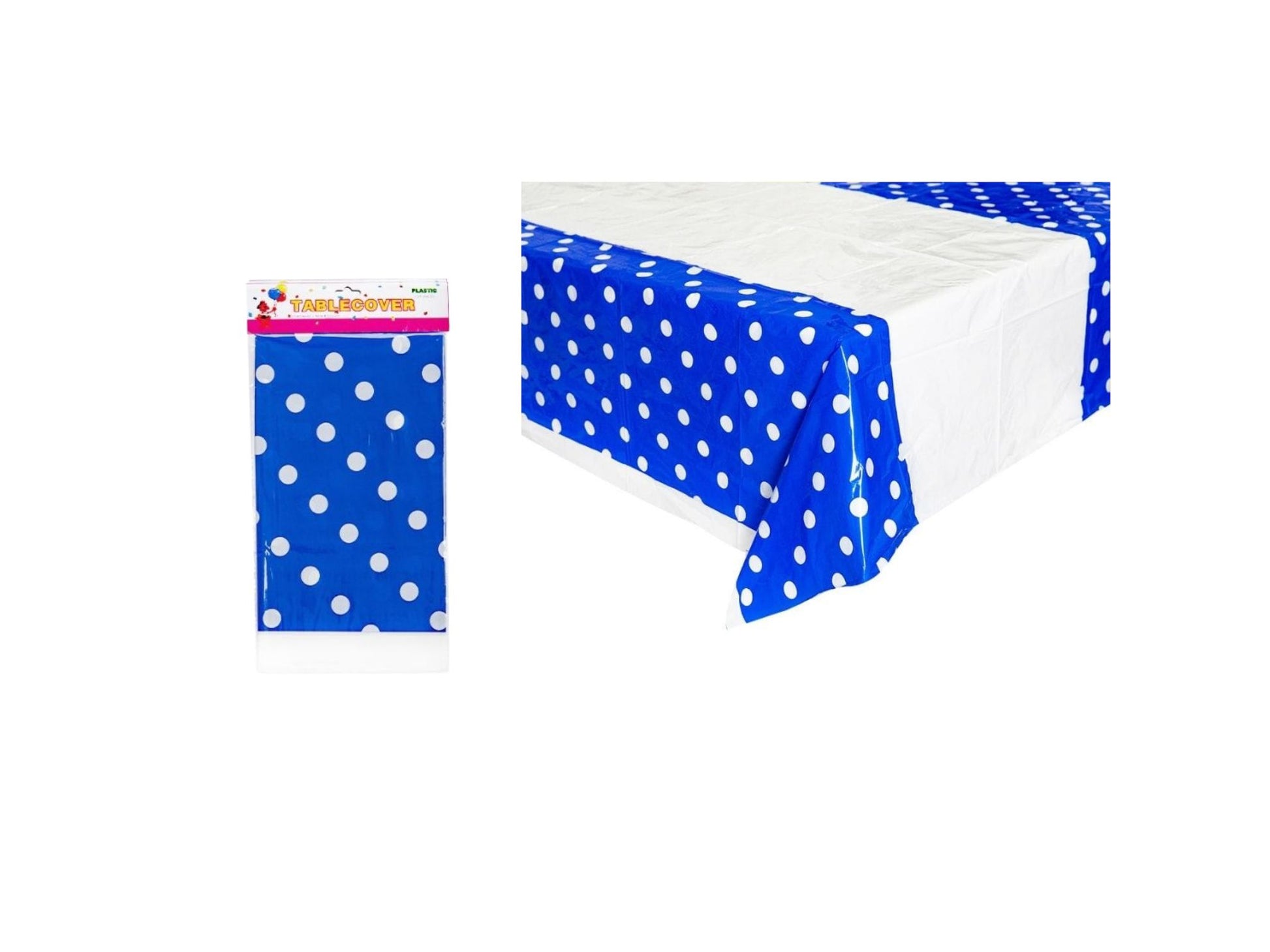 Mantel desechable de color blanco al medio y a los lados color azul con puntos blancos para un ambiente especial a tu evento o reunion.