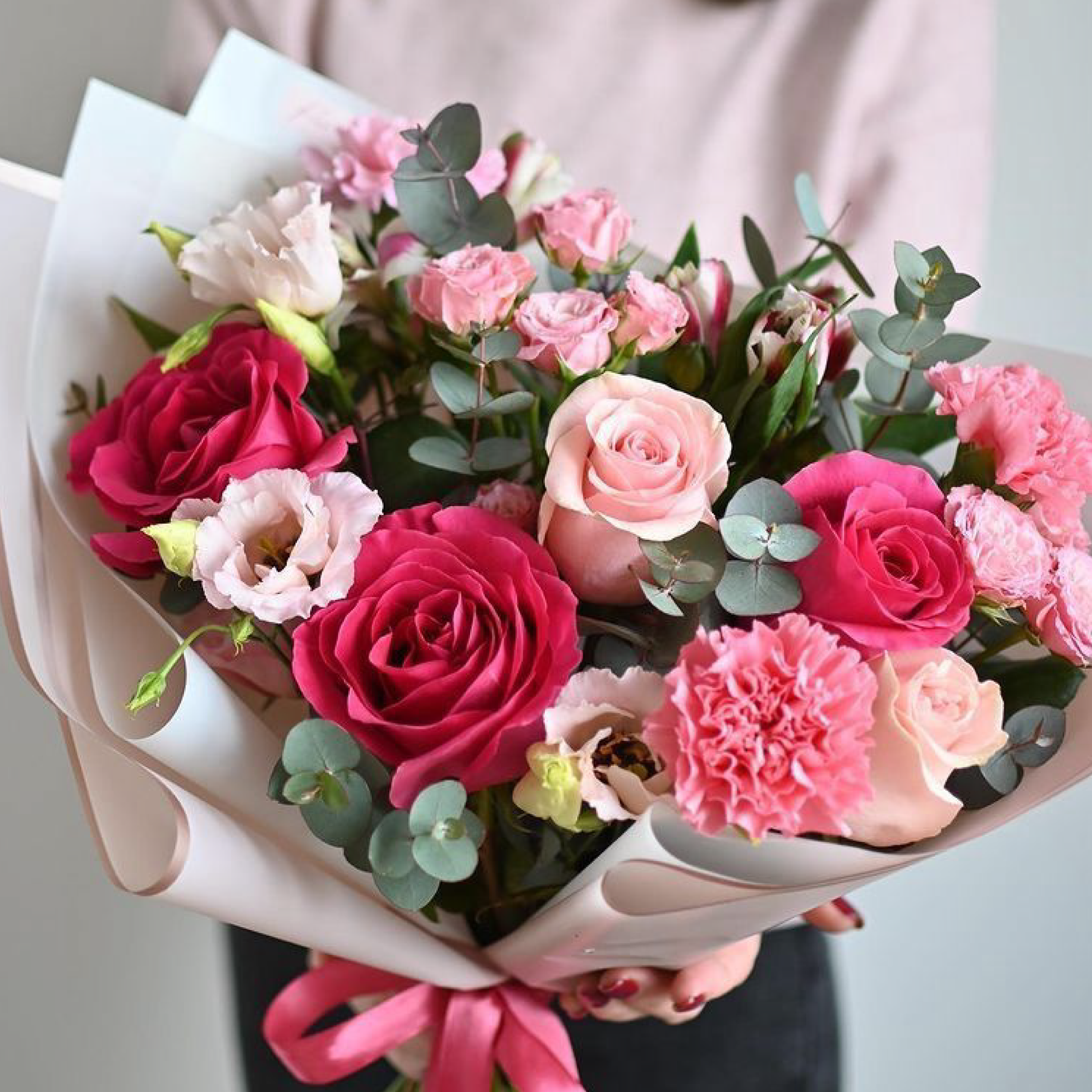 Mix de rosas rosadas pasteles con follaje verde premium. Imagen referencial. Pueden existir ligeras variaciones por stock de rosas.