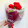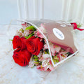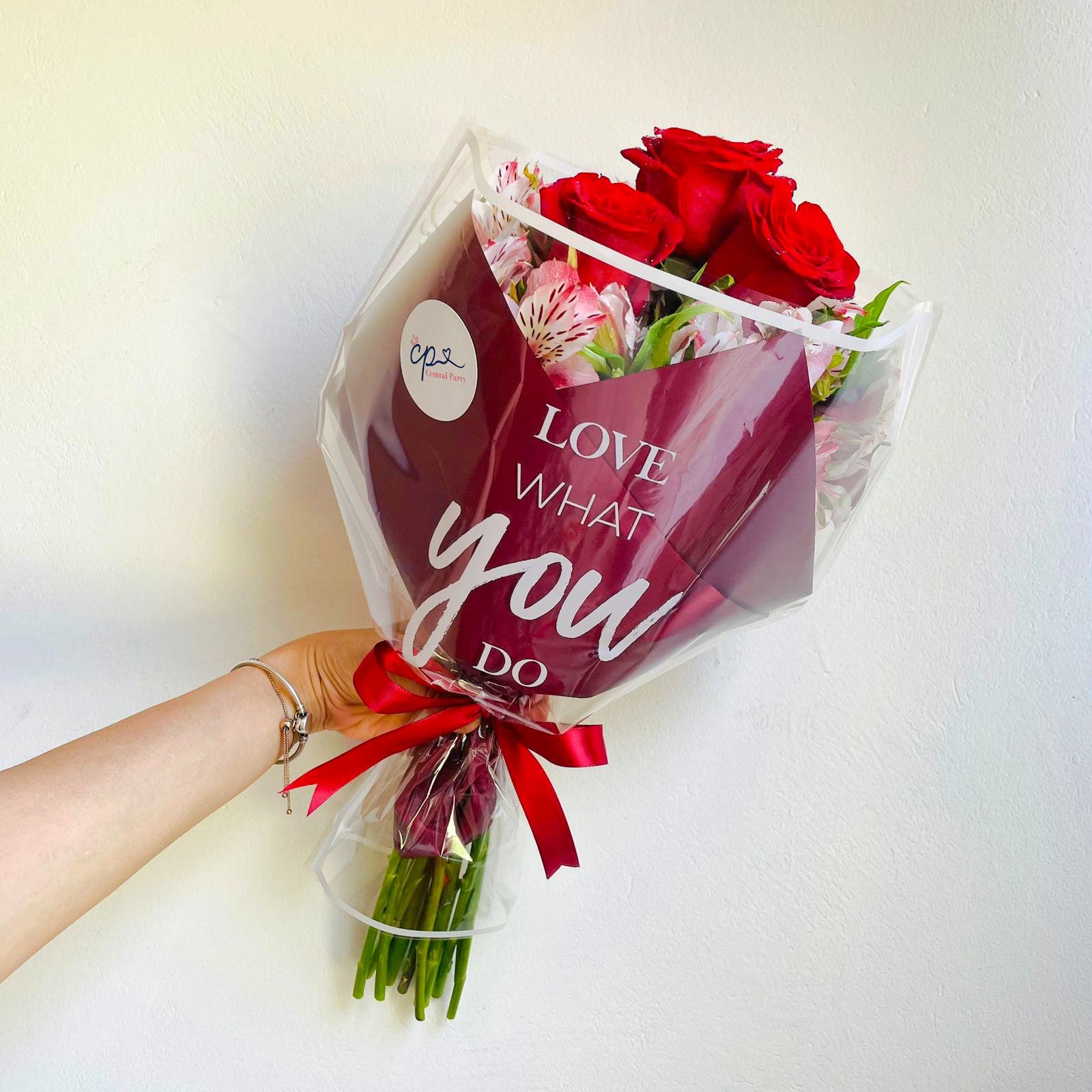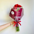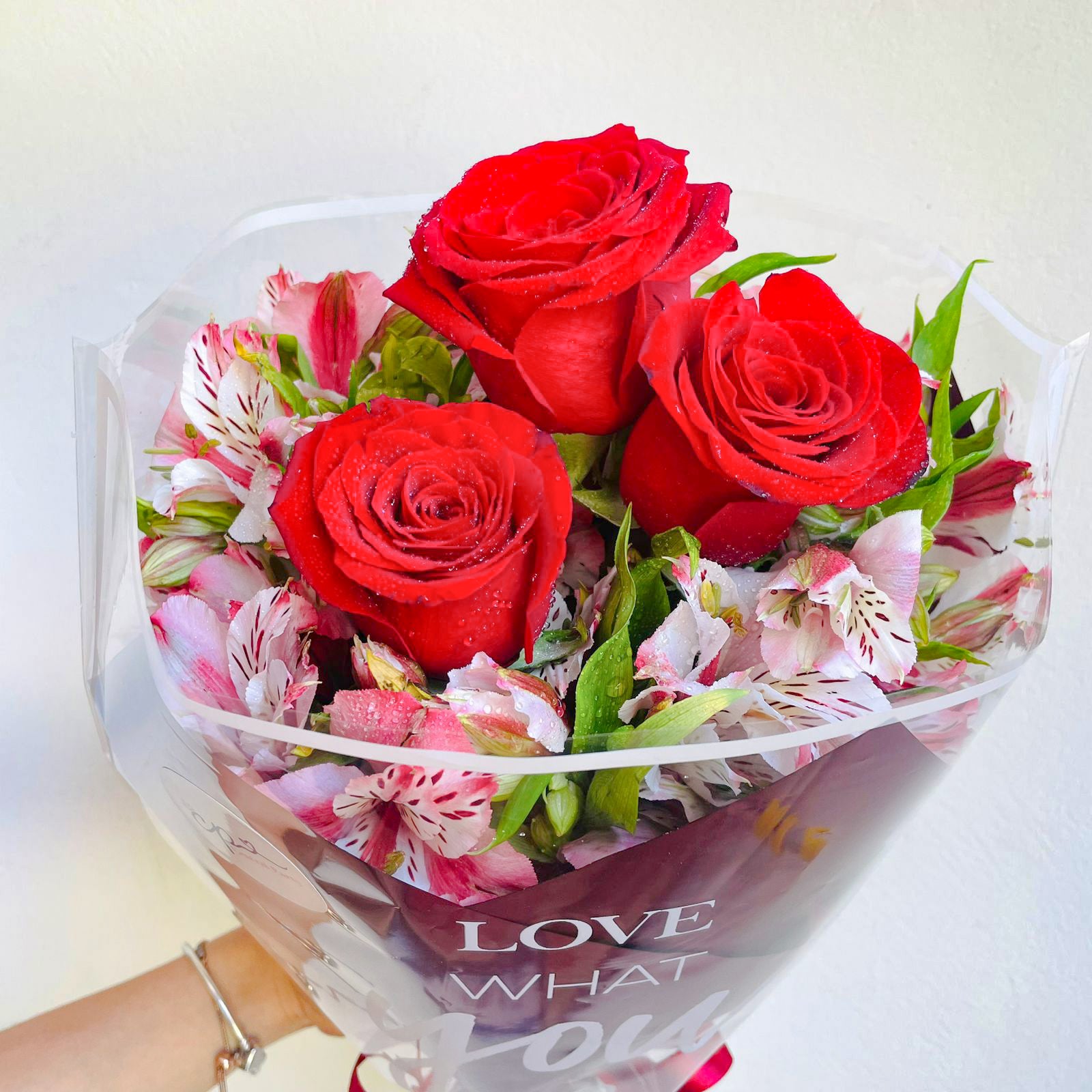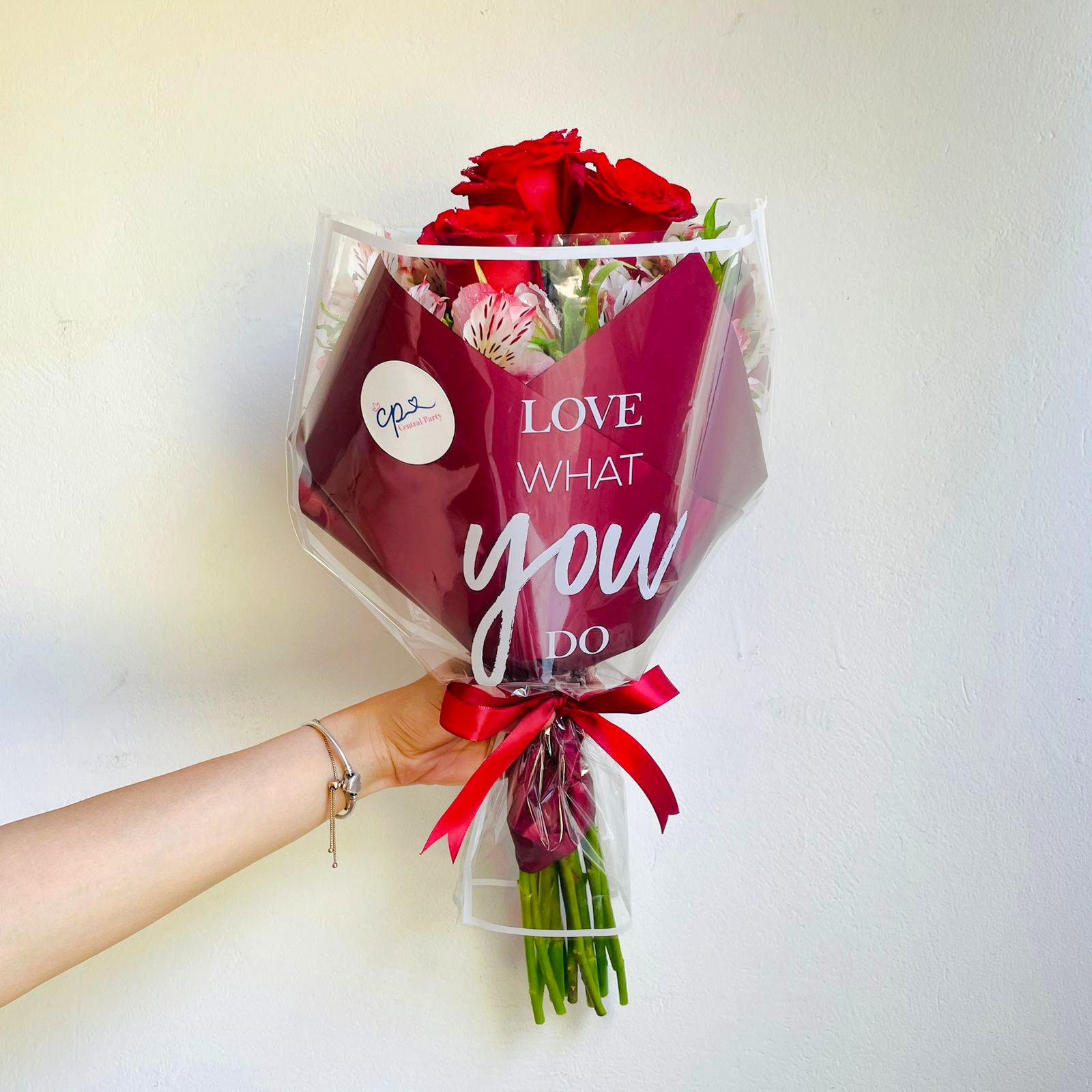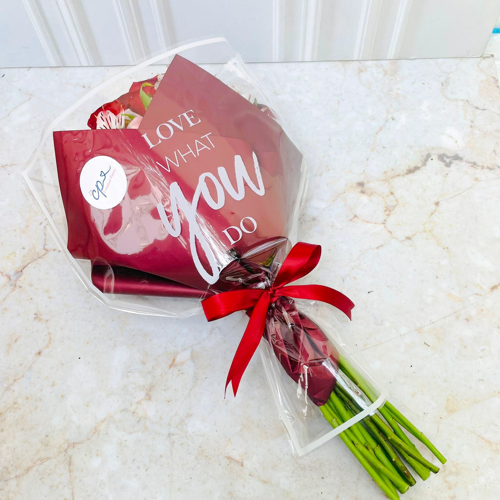 Nuevo ramo con diseño trasparente y listón rojo. Incluye tarjeta dedicatoria.